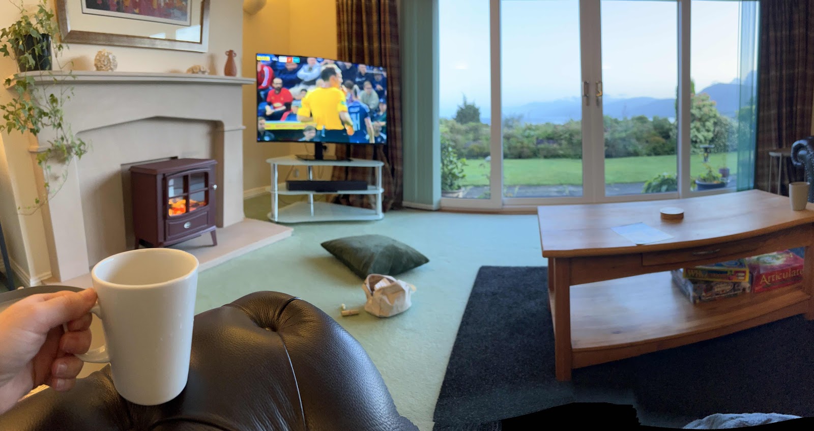 Enjoy the sunset from the living room with a “cuppa,” the Olympics and a cozy blankie.